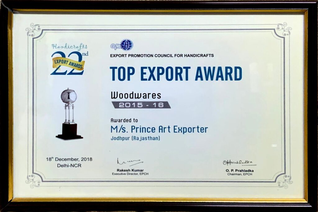 Prince Art Exporter is a family-owned business established in 1959 in Jodhpur, India. Founded by Mr. Manak Chand Luniya, who started the company from his courtyard, it has since grown into a leading name in the furniture industry. Guided by their father’s motivational words, “Get Inspired, Think Big and Take Action” his three sons—Rajendra, Mahaveer and Narendra—have worked diligently to uphold and expand the company’s legacy. Now, the third generation continues this tradition of excellence.